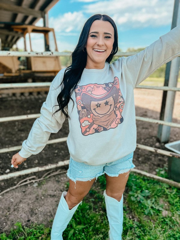 Yee Haw Tan Happy Cowboy Chenille Patch Sweatshirt
